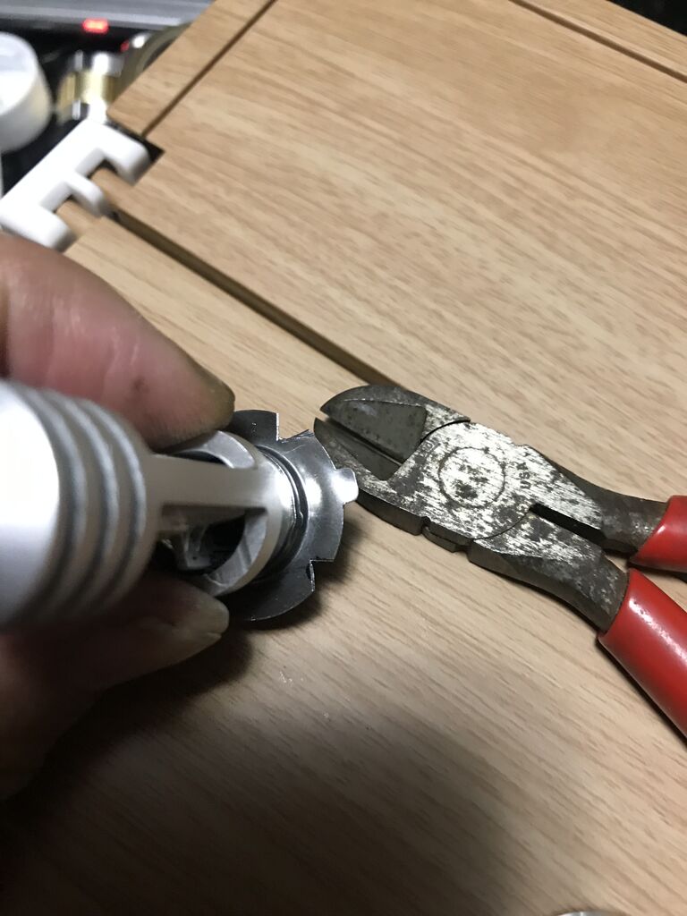 今度はLEDバルブの縁の一部を突起が引っ掛かる様にカットします。
